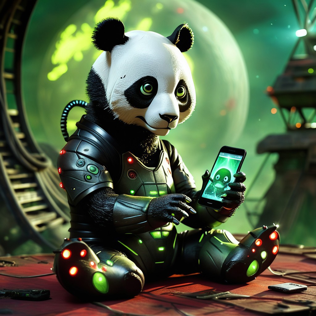 alienworld, A realistic panda wearing a alien extraterrestrial mask. The panda is holding a smartphone standing in front a alien ship