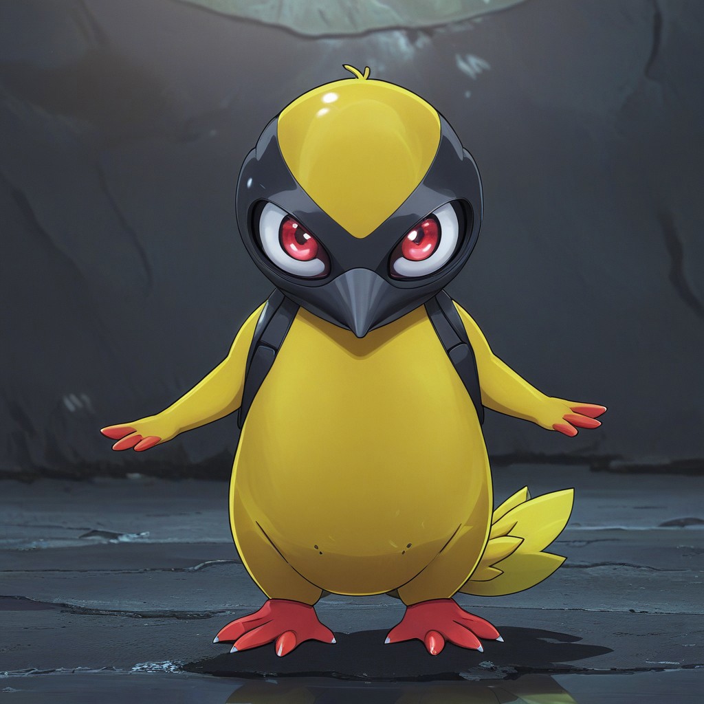 alienworld, psyduck, pokemon \(creature\), no humans, solo, alien extraterrestrial background, standing, full body, hands on own head, animal focus, bird, duck, black eyes, silver, alien feathers, looking at viewer, closed mouth, arms up.