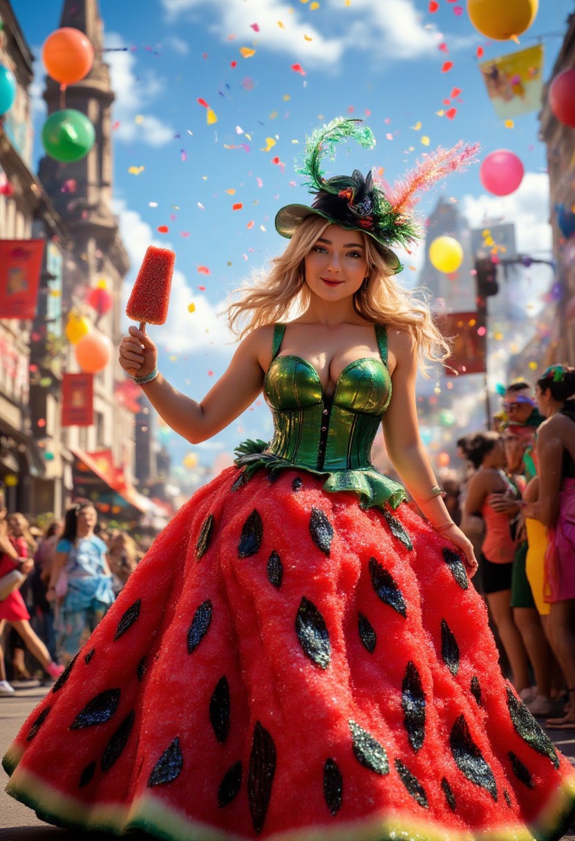 Ultra-detailed digital artwork, photorealistic style. A cheerful young woman wearing a whimsical watermelon costume: a glossy green corset with black stripes, a voluminous skirt shaped like a sliced watermelon (vivid red with shimmering black 'seeds' made of sequins). She dances joyfully at a sunlit summer parade, her hair flowing in motion, skirt swirling dynamically. Around her: a festive crowd in colorful costumes, confetti explosions, floating balloons, and banners decorating a vibrant city street. Background: blue sky, historic buildings adorned with flags. Style: Hyper-realistic textures (glistening watermelon rind, fabric folds on the corset), dramatic contrast between light and shadow, saturated colors. Magic elements: Soft glow around the sequin seeds, feathered hat resembling watermelon leaves, holding a glittering popsicle shaped like a watermelon slice. Atmosphere: Pure joy and celebration, golden-hour lighting with sun flares, intricate details (individual sequins, strands of hair, confetti reflections). Technical specs: 8K resolution, cinematic depth of field, Unreal Engine 5 rendering