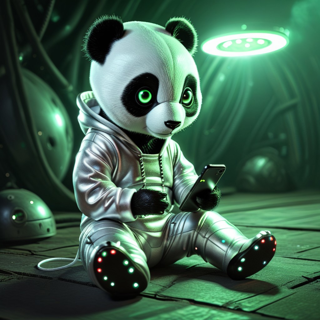 alienworld, A realistic alien extraterrestrial panda wearing a silver hoodie and silver converse. The panda is holding a smartphone standing in front a alien ship or ufo