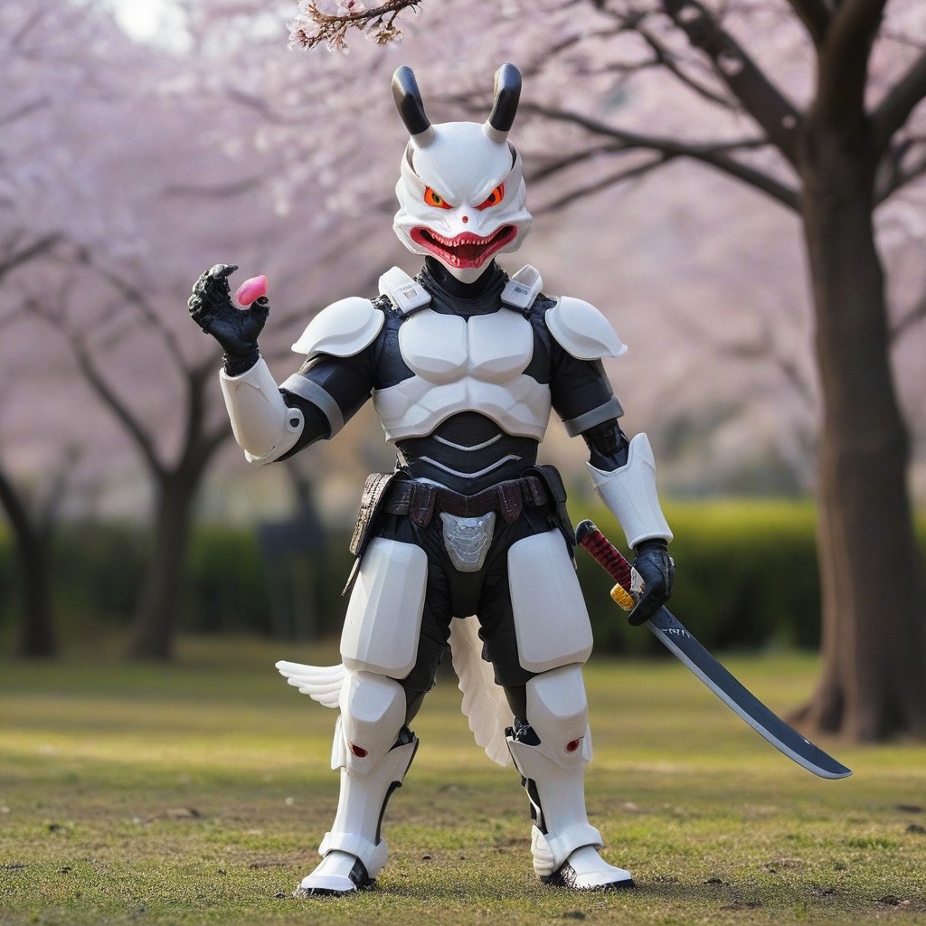 novuschroma53 style, A realistic Samurai holding a duck, solo, armor made of plastic, 1boy, male focus, holding, dual wielding, samurai, helmet made of plastic, horns, holding plastic duck, japanese armor made of plastic, light pink skin, red eyes, full body, fighting stance, Tokio background, tokio, Sakura tree, cherry blossom tree, tree, glowing, glowing eyes, sheath, standing, gloves, teeth, japanese clothes, white hair, shoulder armor, demon, looking at viewer, duck mask made of plastic, ponytail, fangs, sharp teeth, plastic shape armor