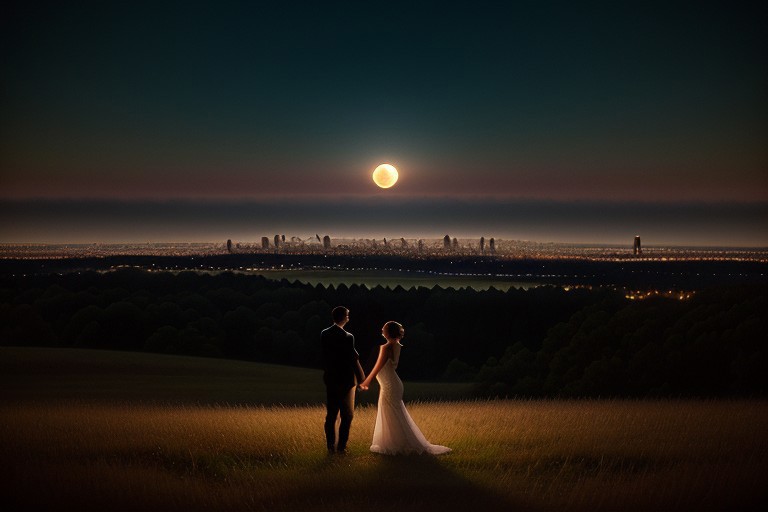 A breathtaking romantic evening scene, a young couple standing under a full moon, gazing into each other's eyes, soft golden hour lighting, a gentle breeze moving her hair, cityscape lights glowing in the distance, warm ambient glow, dreamy atmosphere, cinematic bokeh, ultra-realistic, 8K HDR, masterpiece, film still from a romantic movie.