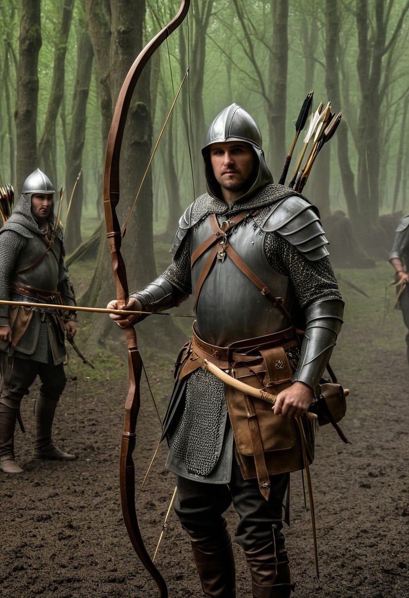 (glowing_arrows:1.5), (elven_runes:1.4),(english_longbow:1.7), (yew_wood:1.6) with (leather_grip:1.5), (hemp_string:1.4), (quiver:1.3) full of (feathered_arrows:1.5), (archer:1.4) in (chainmail_coif:1.3) drawing the bow, (battle_of_agincourt:1.5) background with mud and rain, dynamic_action_pose, ultra_detailed_textures, PBR_materials, cinematic_lighting, 8k, historical_accuracy, by Karl Kopinski