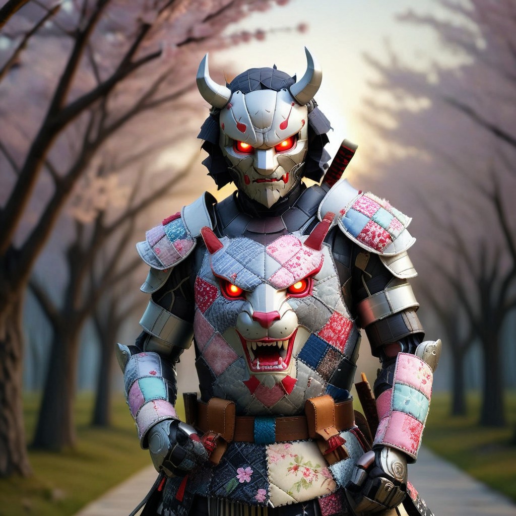 ptchkrawk, A realistic Samurai holding a teddy bear, solo, armor made of patchwork fabric, 1boy, male focus, holding teddy bear, dual wielding, samurai, helmet made of patchwork fabric, horns, holding, japanese armor made of patchwork fabric, light pink skin, red eyes, full body, fighting stance, Tokio background, tokio, Sakura tree, cherry blossom tree, tree, glowing, glowing eyes, sheath, standing, gloves, teeth, japanese clothes, white hair, shoulder armor, demon, looking at viewer, teddy bear mask made of patchwork fabric, ponytail, fangs, sharp teeth, patchwork fabric shape armor