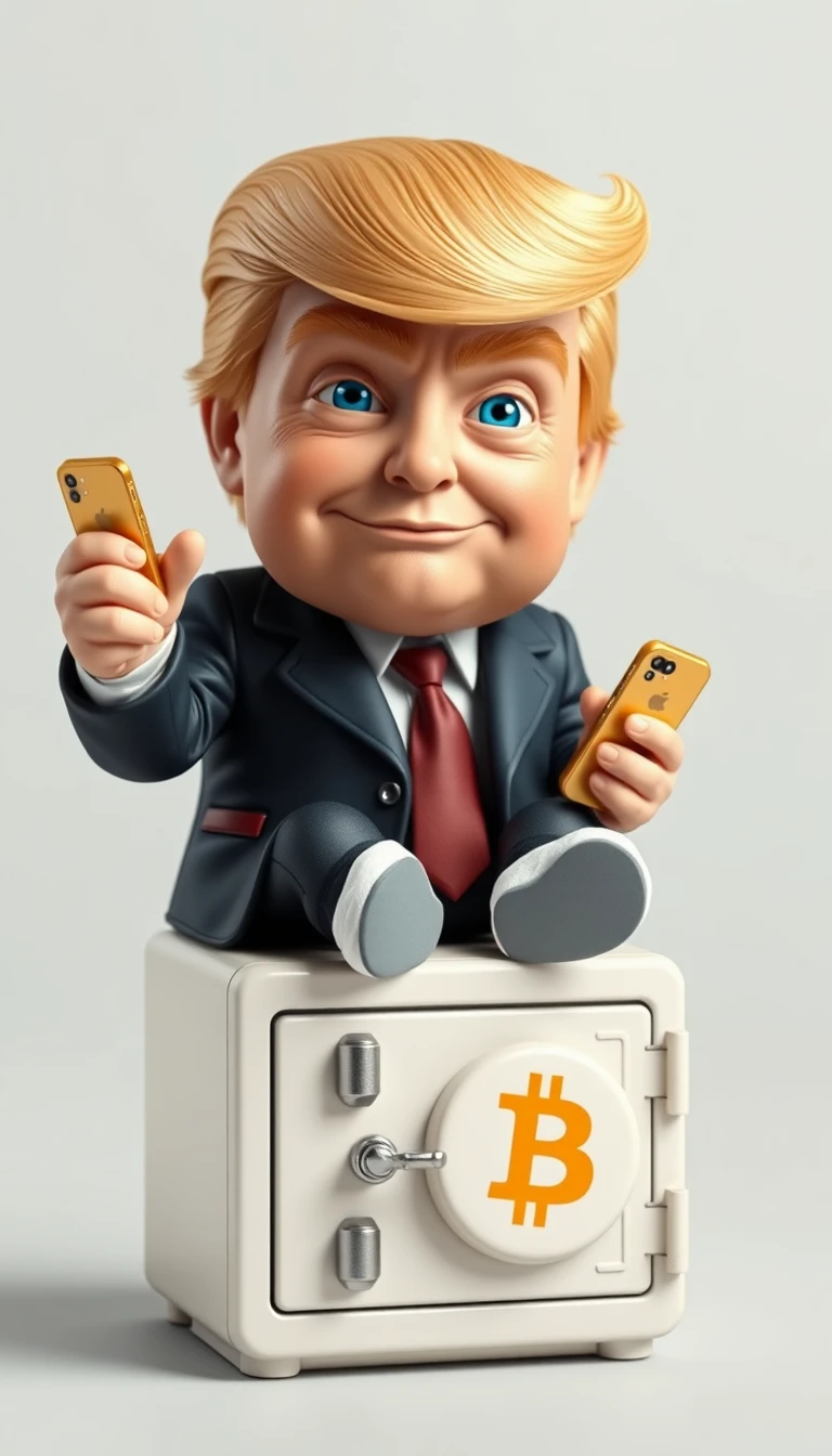 A real-life mini-cartoon of "Barron Trump" with a flattering appearance and a sarcastic smile on the corner of his mouth, blue eyes. He has his right hand raised in a positive gesture and is holding a gold iPhone in his left hand. He is sitting on top of a mini safe with the Bitcoin logo on it. He is wearing cute and funny slippers and is looking at the camera, winking with his left eye.
