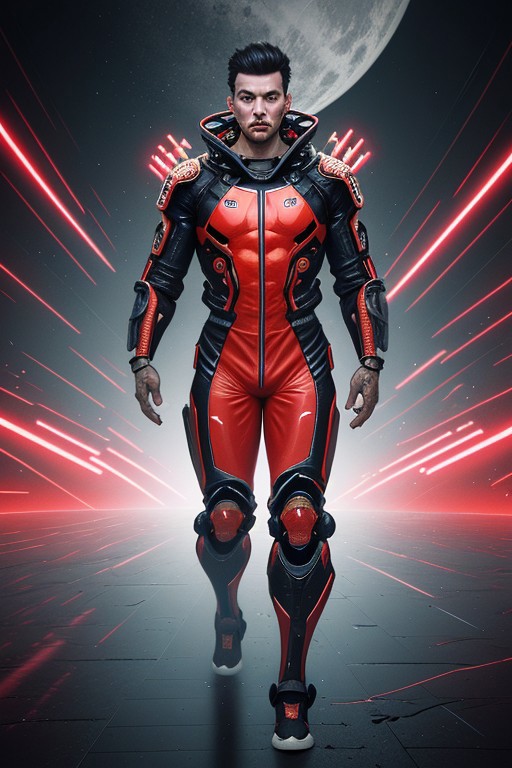 Photorealistic 8k RAW photo of a full-body muscular man with a handsome face and tan skin, sporting short black hair and a clean-shaven face, undercut hairstyle, no beard. He is wearing a colorful fiberglass jumpsuit in a red cyberpunk style, featuring ornate patterns and textures. Set against a background filled with soft red and white neon hexagons, featuring a futuristic sci-fi aesthetic. The image is ultra-detailed with high-resolution clarity, natural lighting, and a focused composition on his stylish attire and the vibrant, futuristic backdrop. award-winning, professional, highly detailed, vivid colors, intricate designs, colorful, patterns, intricate, rich colors, adrr-zllj, mosaic tilework, tinted photo, deep misty valley, glowing, steampunk,Hyperspeed,VIVID