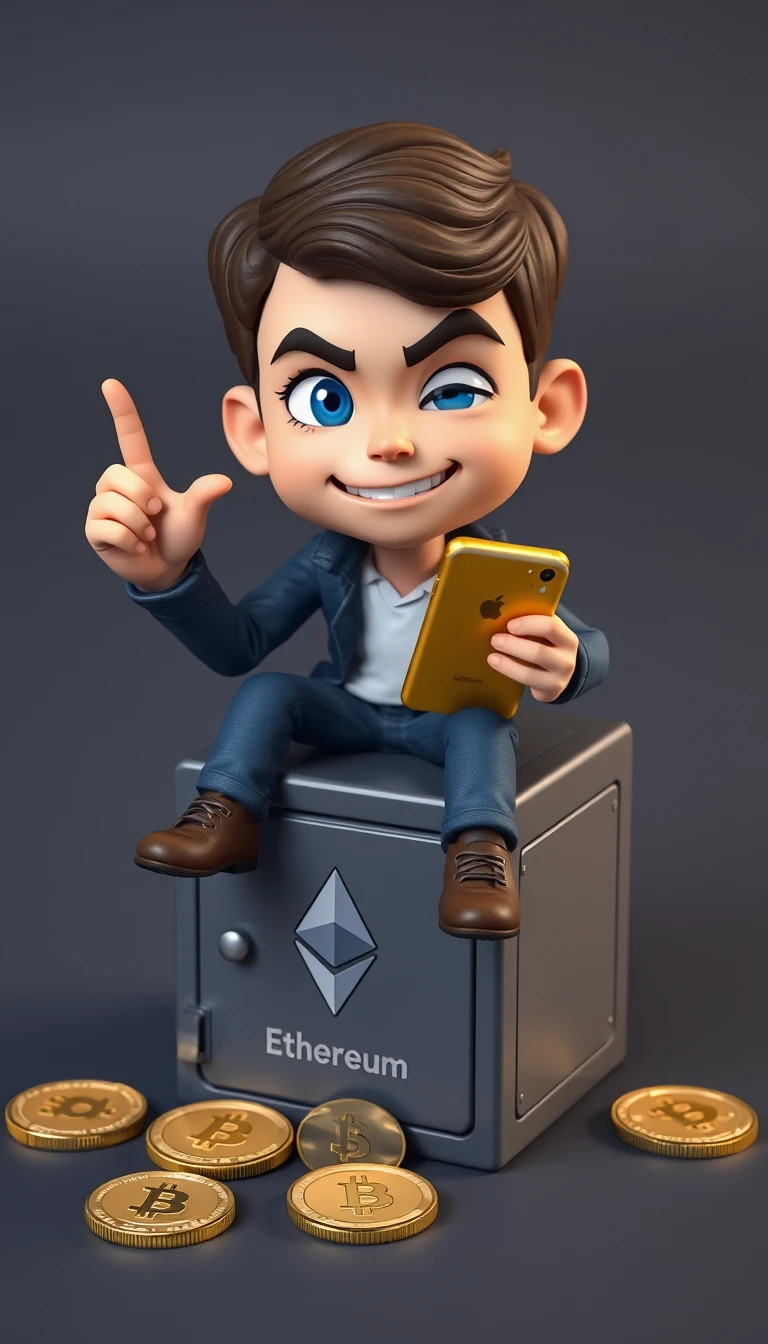 A real-life mini-cartoon of "Vitalik Buterin" with a flattering appearance and a sarcastic smile on the corner of his mouth, blue eyes. He has his right hand raised in a positive gesture and holds a gold iPhone in his left hand. He is sitting on top of a mini safe with the Bitcoin logo on it. Several "Ethereum" coins scattered on the floor He is looking at the camera, blinking with his left eye. Image defined in 3D.