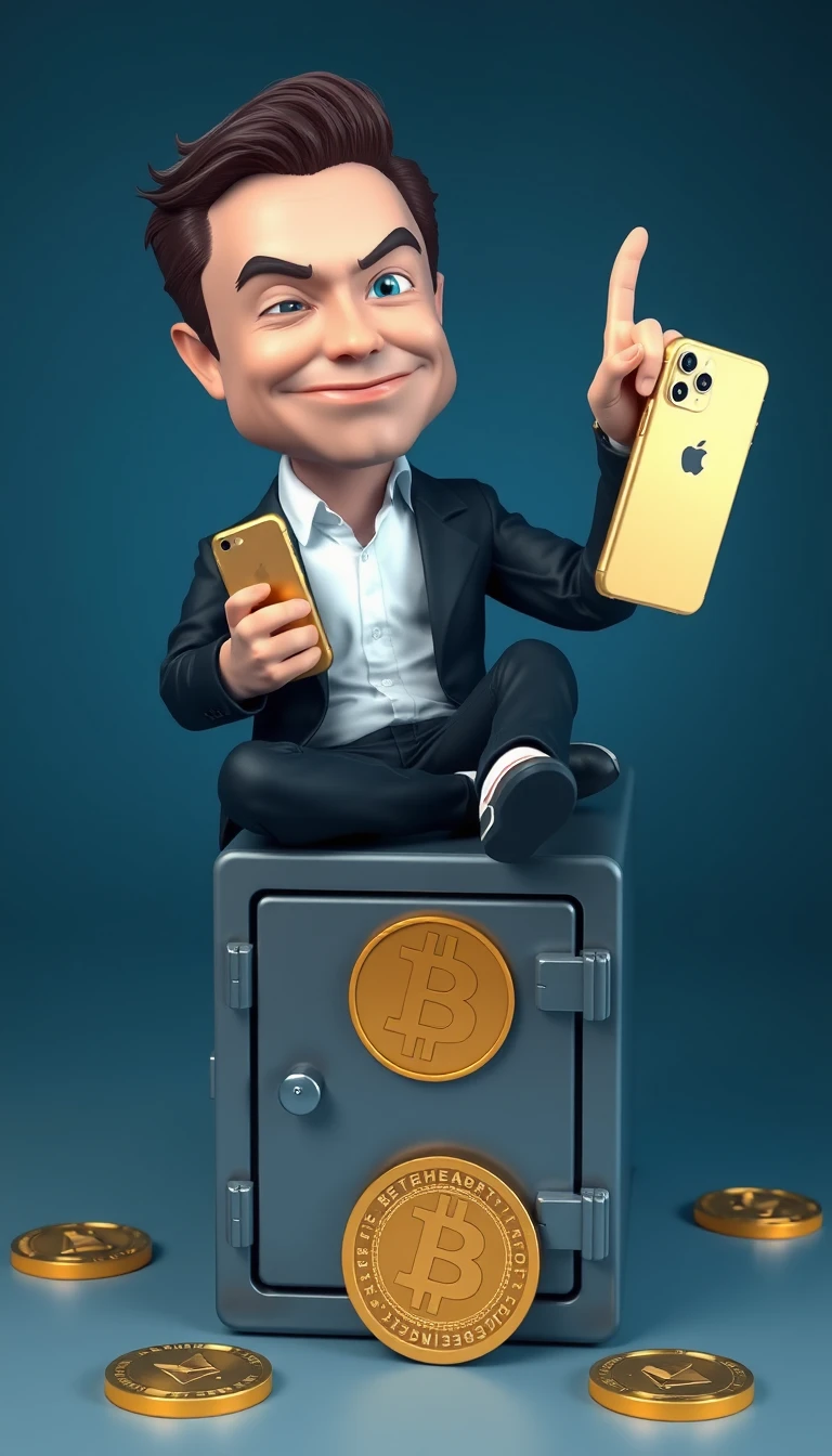 A real-life mini-cartoon of "Elon Musk" with a flattering appearance and a sarcastic smile on the corner of his mouth, blue eyes. He has his right hand raised in a positive gesture and holds a gold iPhone in his left hand. He is sitting on top of a mini safe with the Bitcoin logo on it. Several "Ethereum" coins scattered on the floor. He is looking at the camera, blinking with his left eye. Image defined in 3D.