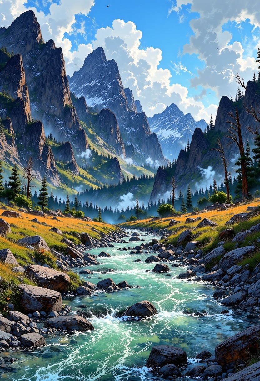 Patagonian Valley – Wild Rivers & Towering Peaks "A remote valley in Patagonia, where jagged mountain peaks rise sharply from the untouched wilderness. A wild, rushing river carves through the valley, its turquoise waters fed by distant glaciers. The land is dotted with golden grasses and twisted, wind-swept trees, adding to the raw, untamed beauty of the landscape."