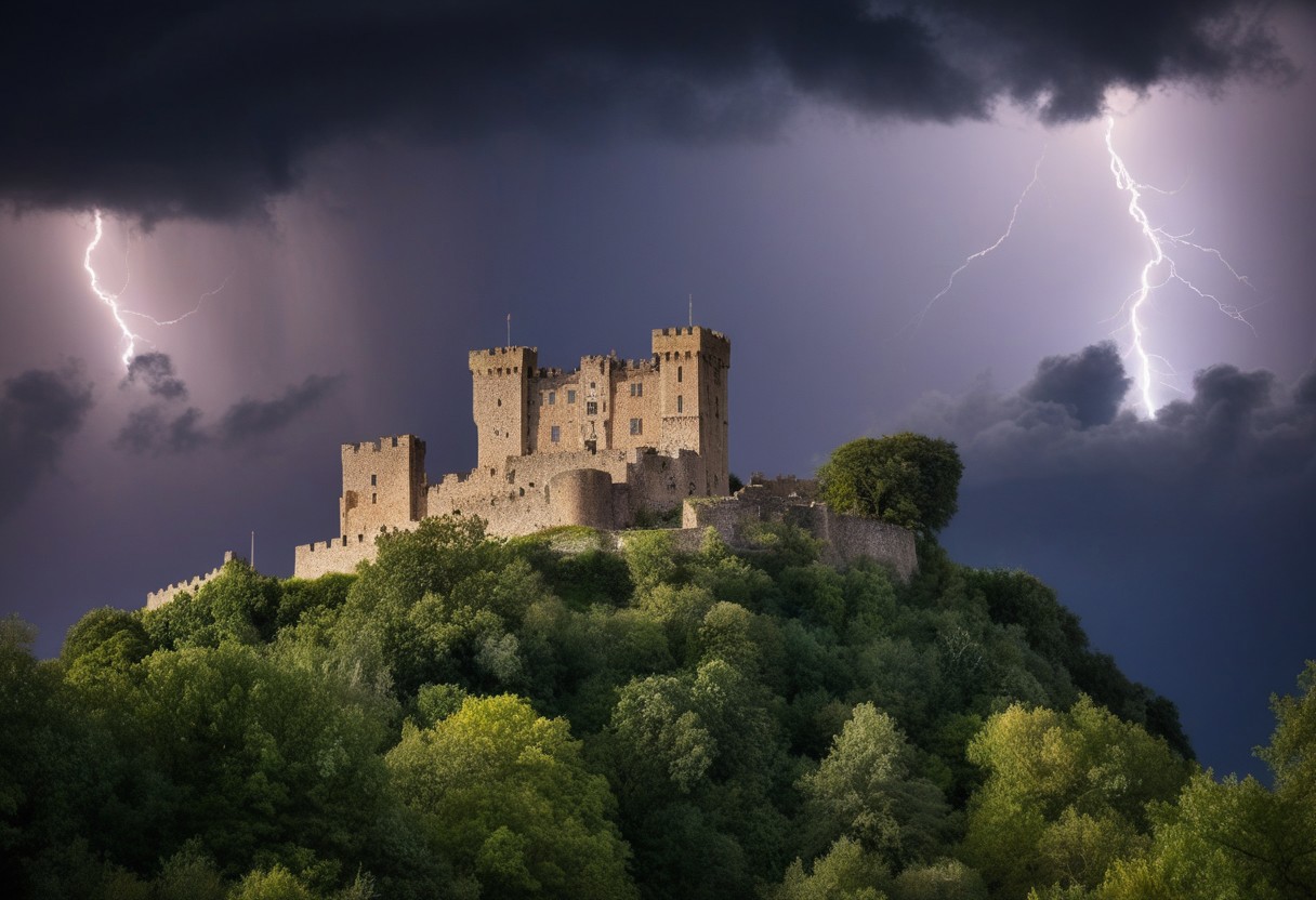 photograph surrounded by trees at the bottom and leaves at the top in the foreground, in the background in the center old castle on a cliff and stormy sky with lightning