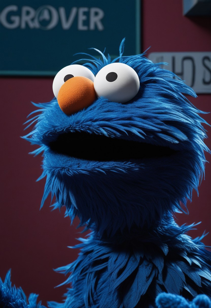 Grover, Sesame Street as a background Masterpiece, Best Quality, flat, Manga Scan, Anime, cinematic lighting, drawn Art, by Studio Trigger, clip studio paint, Anime Wallpaper, Deep Color, Cel-Shaded
