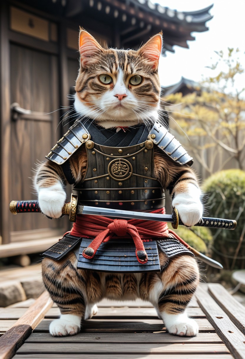 cat using samurai armor, cat holding katana sword, sword stance, cat warrior, training yard, medieval japan