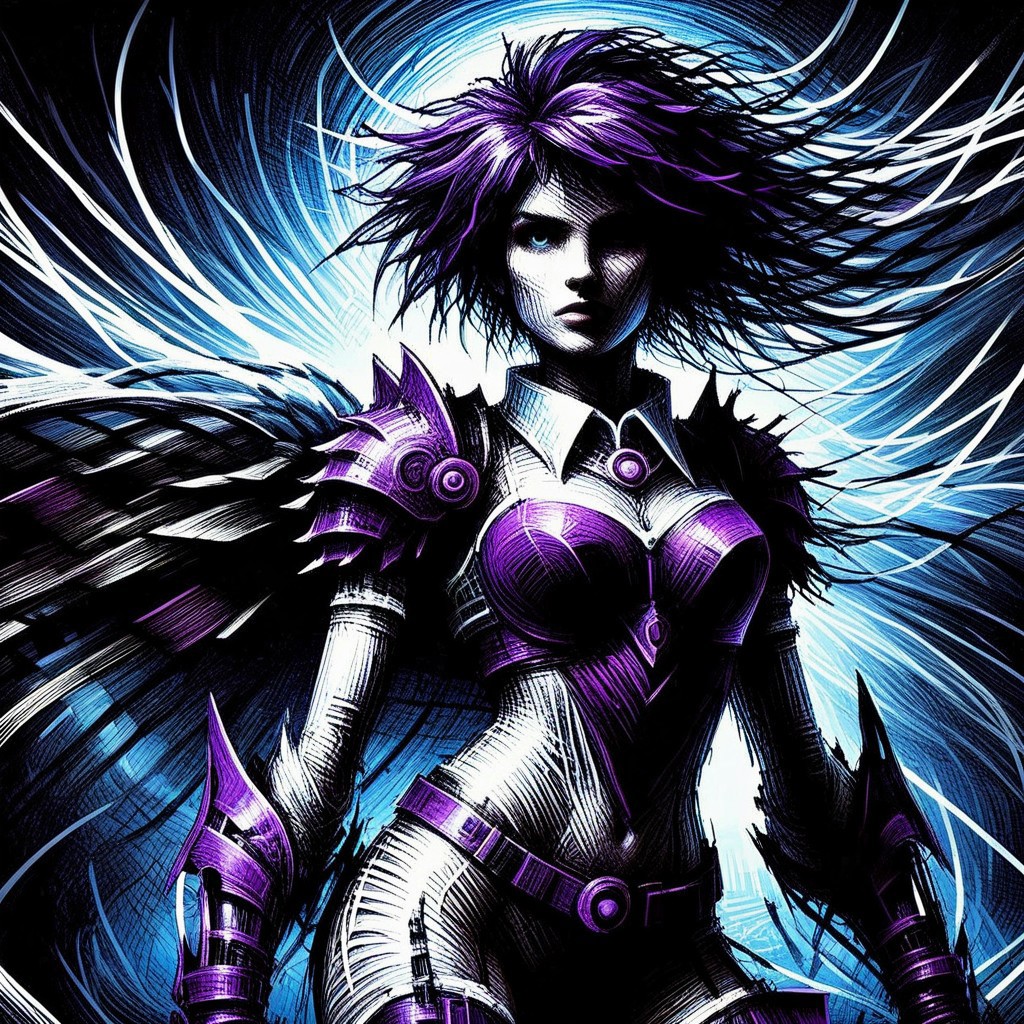 ScribbleRay, black and white, doodle, messy, dirty, hard lines, (scribble:1.5) , sketch of a female character with a futuristic, fantasy-inspired design. The character has fair skin and short, purple hair adorned with a white flower. She has large, expressive blue eyes and a delicate, feminine face. She is dressed in a vibrant, white and purple outfit that includes a short, frilly dress with a white collar. The dress has a high slit, revealing her black thigh-high stockings and a glimpse of her upper thighs. Her attire is complemented by long, brown gloves and matching boots with brown accents. She wears a white belt with a purple gem at the center, adding to the futuristic aesthetic. The character is equipped with large, wings that have a glowing blue hue, giving her a celestial appearance. Her arms are outstretched, and she appears to be in mid-flight or leaping, suggesting motion and energy. The background is a futuristic city landscape.
