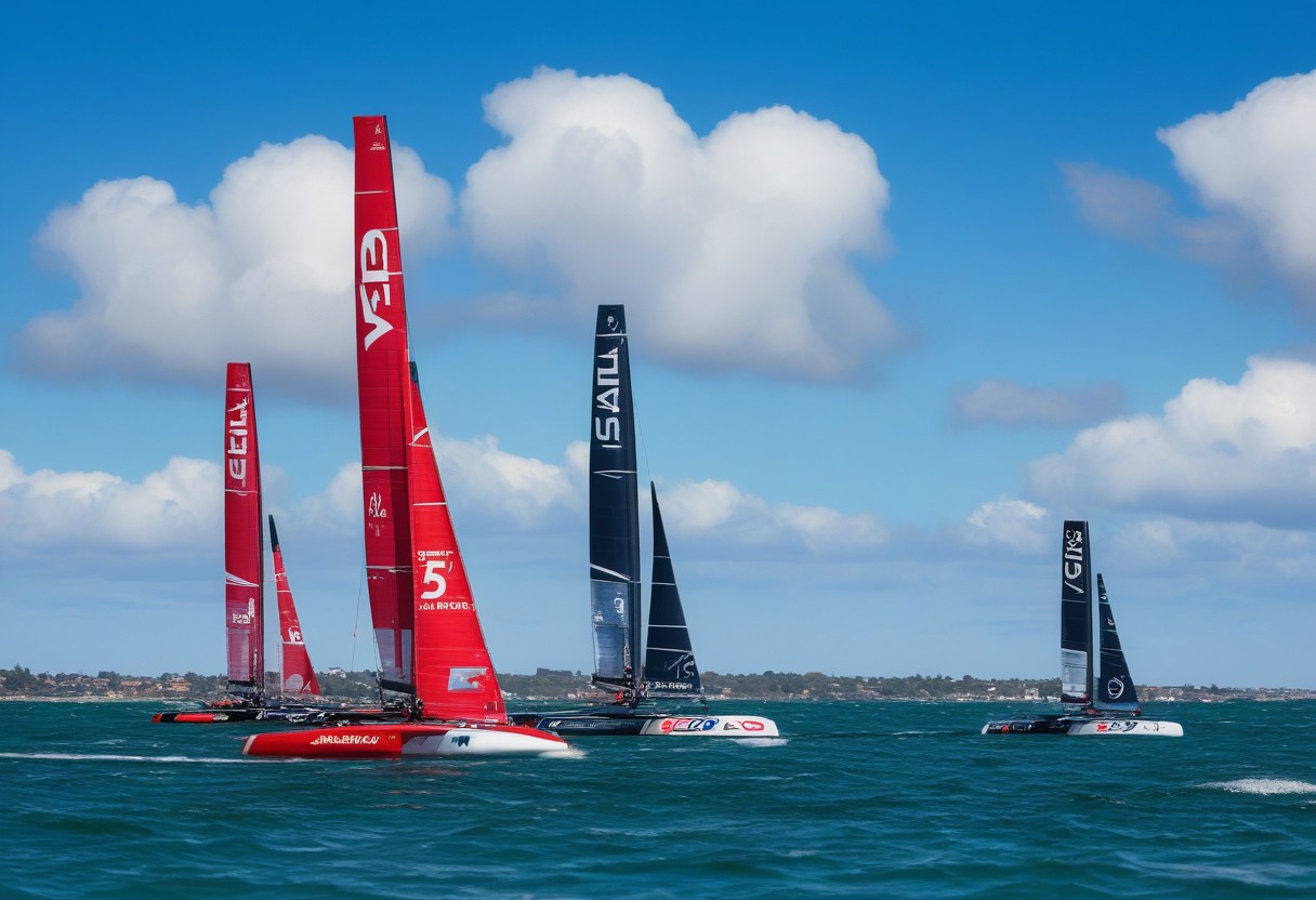 SailGP race, international crew competition made up of several one-design race-style regattas, high-performance F50 class catamarans, blue sea background with waves and a blue sky with cumulus clouds