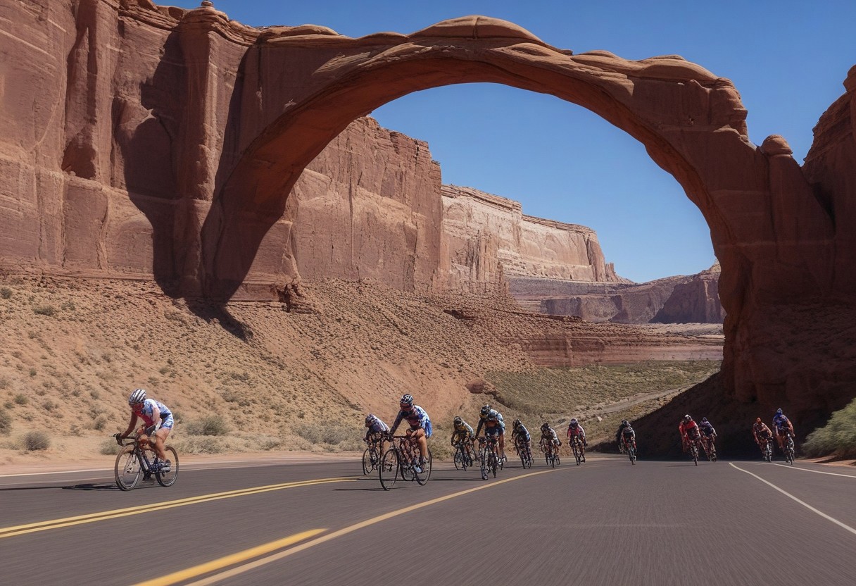 close-up bike race in the Utah desert, very realistic photography, background arches and cliffs of Utah