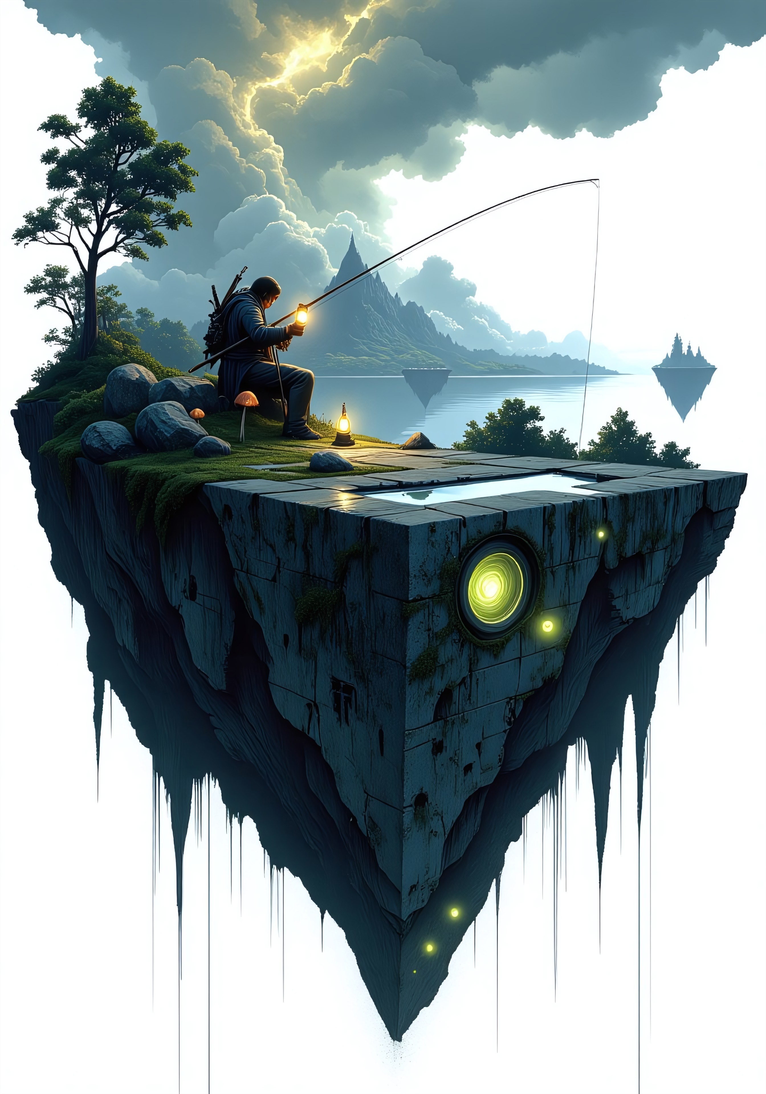 A fantasy concept art illustration of a lone fisherman sitting on the edge of a floating rock formation, casting his fishing line down into the white void below. The rock is covered in patches of moss and small glowing mushrooms, giving it a mystical appearance. A few ancient ruins with engraved symbols are scattered on the rock, hinting at a forgotten past. The fisherman wears a weathered cloak, and his lantern glows softly, illuminating the misty surroundings. The sky above is filled with swirling clouds and distant floating islands, adding to the dreamlike atmosphere. The entire composition is designed in a cutout style, with the white background making it appear as though the fisherman is sitting at the edge of reality itself.
