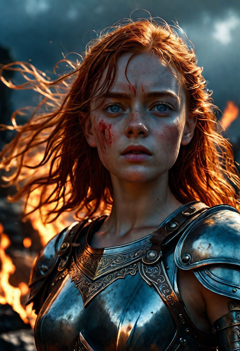 High resolution ultra-realistic of Beautiful burly Joan of Arc, 8k, capturing the intensity of the moment, cinematic lighting, standing on a bloody and stormy Battleground in a fighting pose, wavy red hair, realistic bloody dirty pale face, realistic blue eyes, fire, intricately designed iron and silver medieval armor, brown mini skirt, LOTR Aesthetic, perfect athletic figure, beautiful Sadie Sink as Joan of Arc, fire, ultra realistic, cinematic style, athletic figure, dark fantasy, dramatic lighting, wet and sweaty skin, dirty skin, athletic figure, dark medieval, dramatic lighting, Greg Rutkowski style,, Warrior girl on in iron armor, hyper-detailed, hyper-realistic, bright colours, Attractive 25 old years girl, Attractive, beautiful firm Breasts, sharp focus, digital painting, Photograph Taken on Nikon D750, Alphonse Mucha, 8K, athletic figure, Hyperdetailed, hyperrealism, Attractive, Attractive bust girl, asymmetric balance