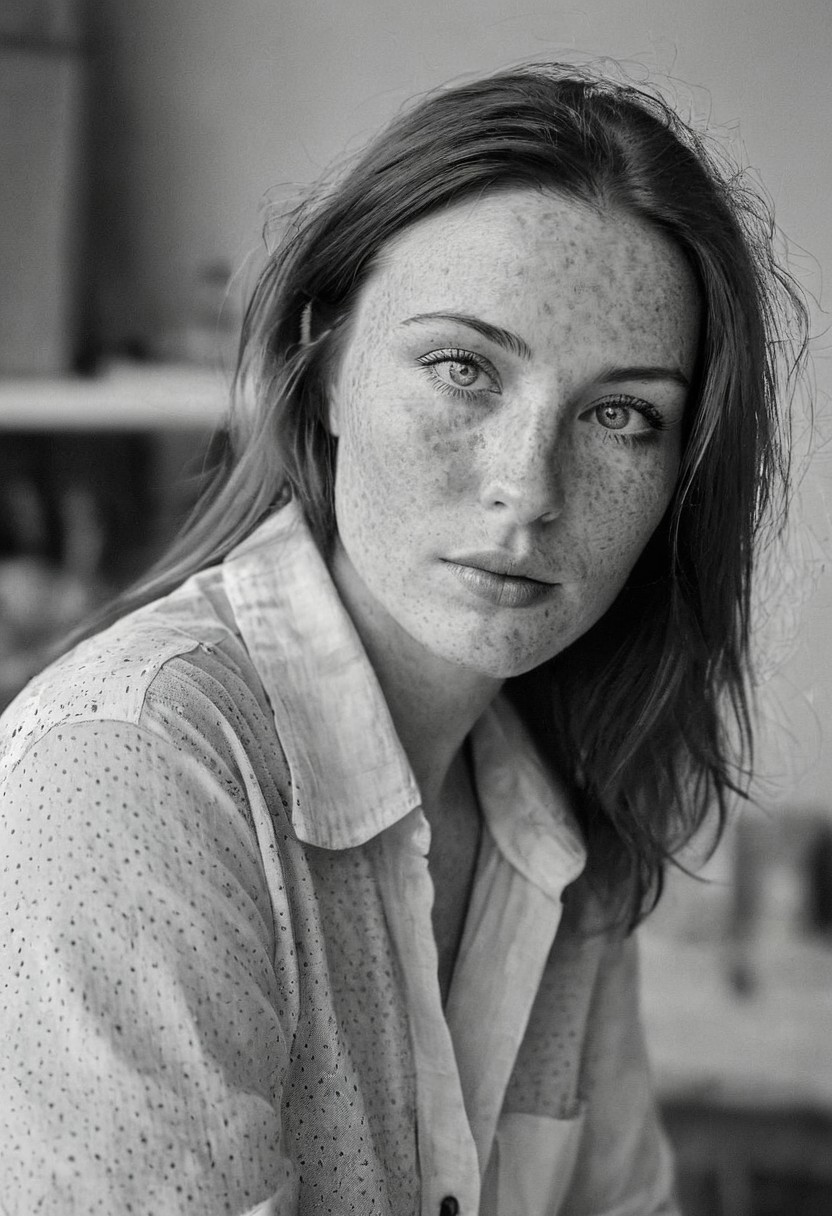 Stunning B&W 35mm photo of a beautiful 35 years old Dutch woman, open shirt, large soft tits, nipples. perfect face, absolute beauty, sexy pose, natural raven red hair, blue eyes, freckles, freckles and moles all over body, absolute perfect tits, big tits, soft natural tits, in her paint studio in Florence, early morning, misty, soft natural early morning light light, 35mm, film grain, masterpiece, sharp focus, shot on Kodak, lens flare, cinematic, (ultra high res: 1.2), (photo-realistic: 1.3) (skin pores: 1.1)