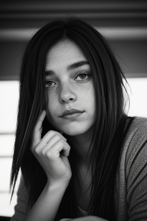 The image portrays a young woman with long, dark hair holding a vintage camera close to her face, partially obscuring one of her eyes. She gazes directly into the lens with an intense, thoughtful expression. The photograph has a distinct cinematic and nostalgic aesthetic, with soft lighting, a grainy texture, and subtle color grading that gives it a vintage, film-like quality. Subject and Composition The subject's face is positioned slightly off-center, drawing immediate attention to her sharp and expressive features. Her dark, well-defined eyebrows frame her deep-set eyes, which are slightly shadowed, adding to the introspective mood of the image. Her lips, which are slightly parted and tinted a natural red, contrast subtly with her smooth, pale skin. Strands of hair fall loosely across her face, reinforcing the unposed, organic nature of the portrait. sexy, The camera she holds is an older model, silver and black with a rounded lens, possibly a vintage point-and-shoot film camera. Its reflective surface catches some light, making it a noticeable focal point. Her fingers gently rest on the camera's body, showcasing her relaxed grip, suggesting familiarity and comfort with the device. The camera partially obscures her left eye, creating an artistic and symbolic interplay between the act of capturing an image and being observed.