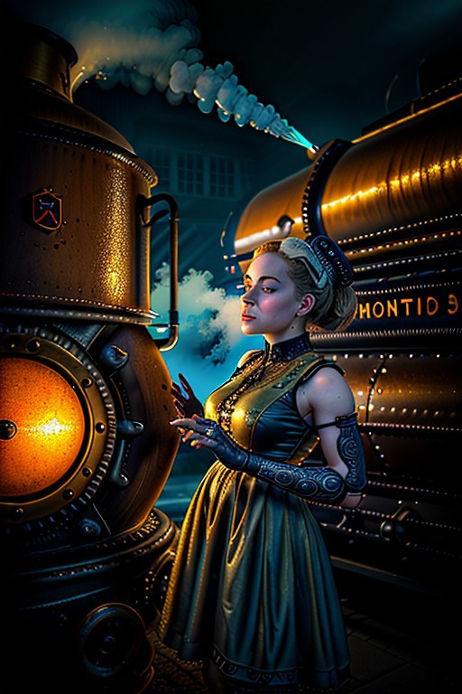 "A whimsical humanoid AI in a steampunk universe, her mechanical features crafted with brass, gears, and clockwork, delicately fused with organic materials like wood and lace. She wears a victorian-inspired dress with intricate designs, holding a glowing gear-shaped artifact. Her expression is serene, her blue eyes reflecting the light of a glowing steam engine in the background. Art style: vibrant and detailed, with warm metallic tones and vintage aesthetics. NEG_EMBED_STABLE_YOGI_V3, cyberg1gerng, cyberg1gerng face,