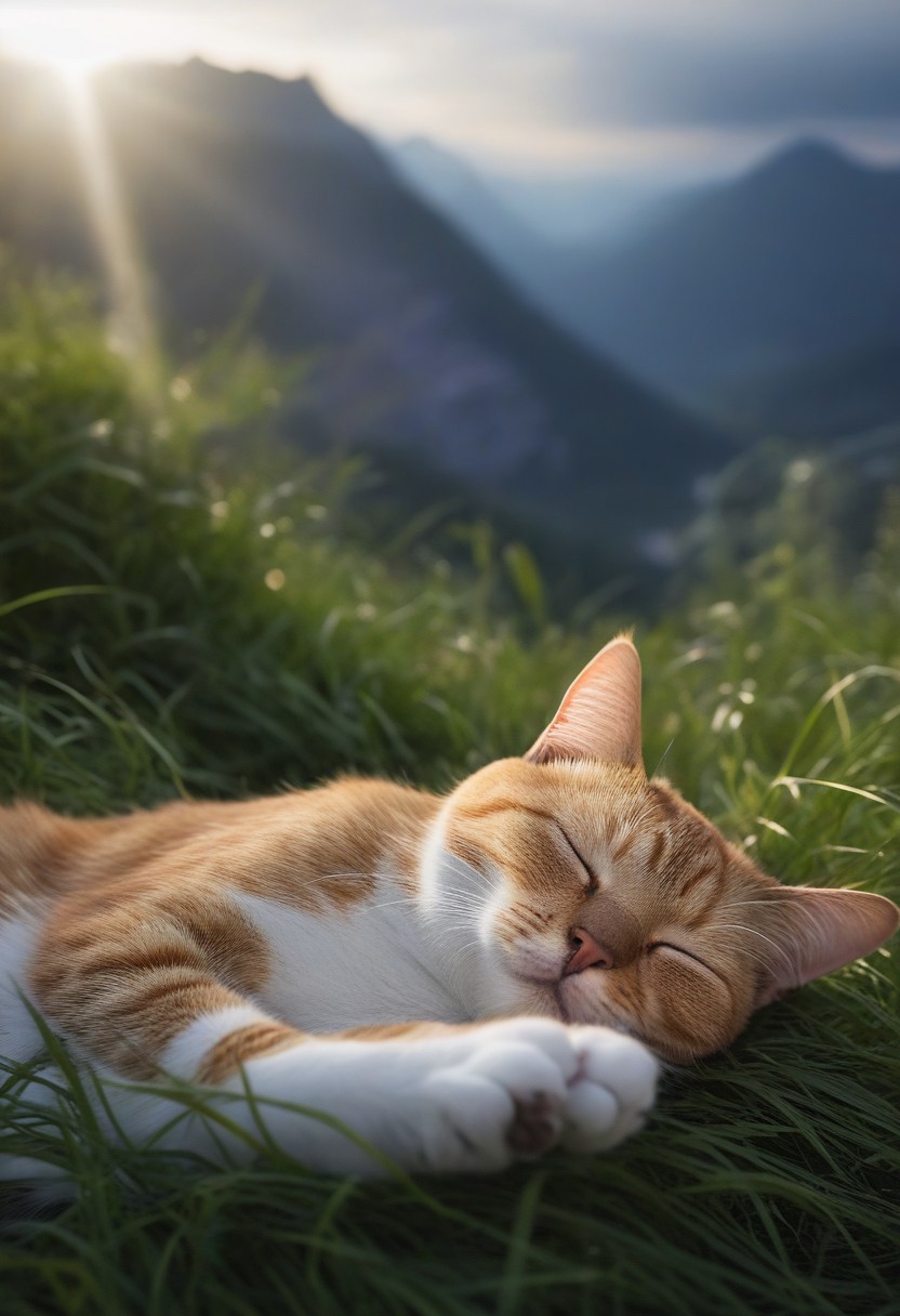 realistic, solo, cat, cute, sleeping, light_particles, nature, mountain, depth of field, the best quality, amazing quality, high quality, masterpiece,