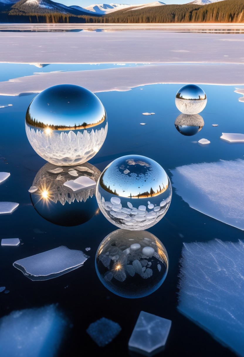 this is formed mercury mirrored spheres embedded in quartz formation in a frozen lake with crystal ice, magnificent abstract modern polarity