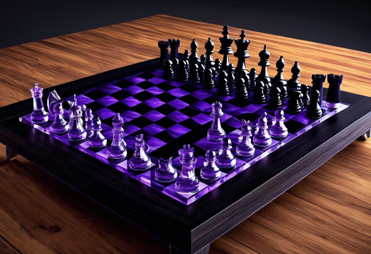 CGI Art, Chess board. Purple and black pieces. Chess pieces are made from crystals. Chessboard and pieces are in the center of a wooden table with two wooden chairs