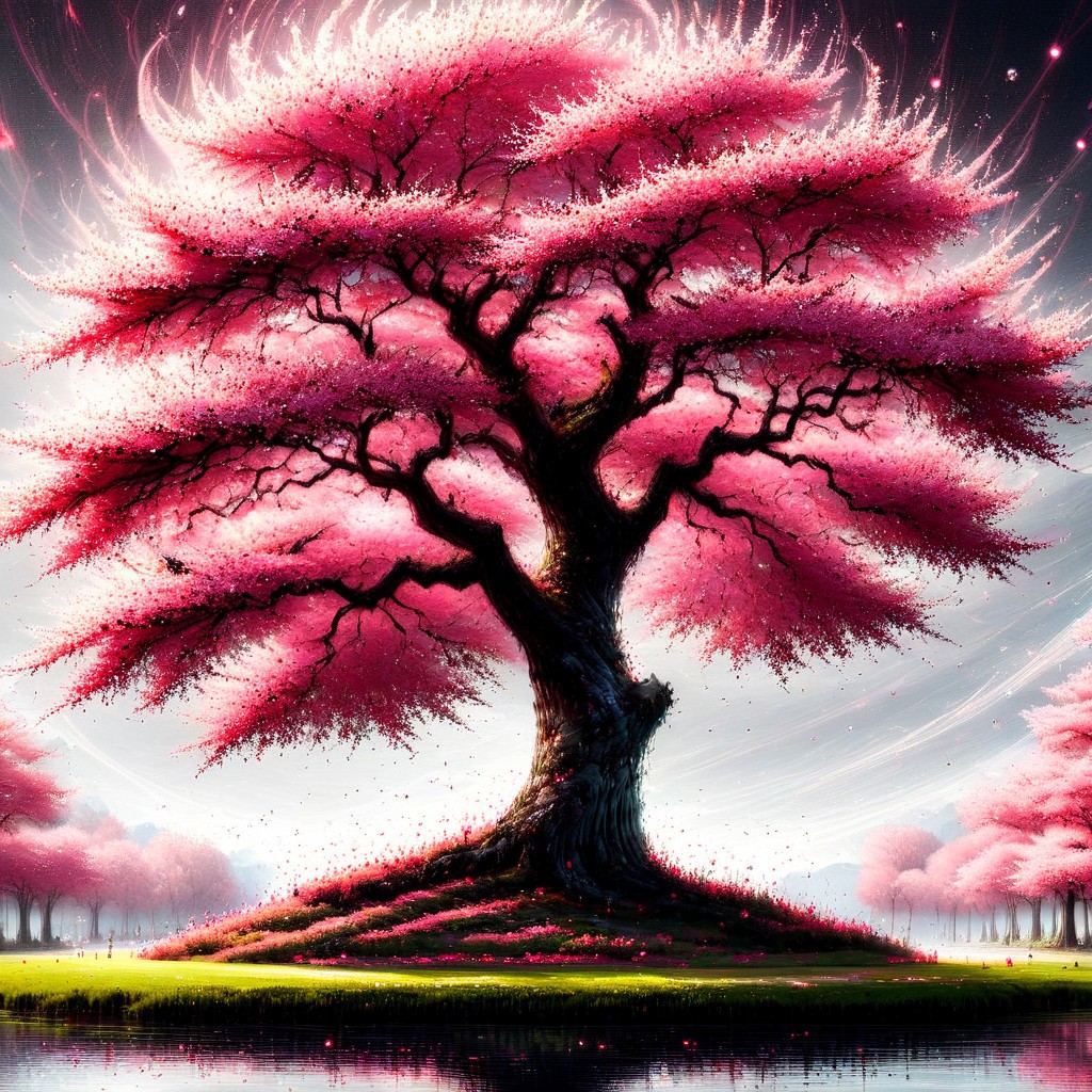 hyper detailed, lush cherry tree, encircled tree, spiral , clear lake, midjourneyv6.1, ScribbleRay