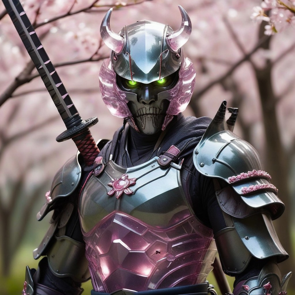 cs-cr1stal-v2, A realistic Samurai holding a sword, solo, armor made of glass, 1boy, male focus, holding, dual wielding, samurai, helmet made of glass, horns, holding sword, japanese armor made of glass, light pink skin, green eyes, full body, fighting stance, Tokio background, tokio, Sakura tree made of glass, cherry blossom tree, tree made of glass, glowing, glowing eyes, sheath, standing, gloves, teeth, japanese clothes, white hair, shoulder armor, demon, looking at viewer, stained glass mask, ponytail, fangs, sharp teeth, glass armor