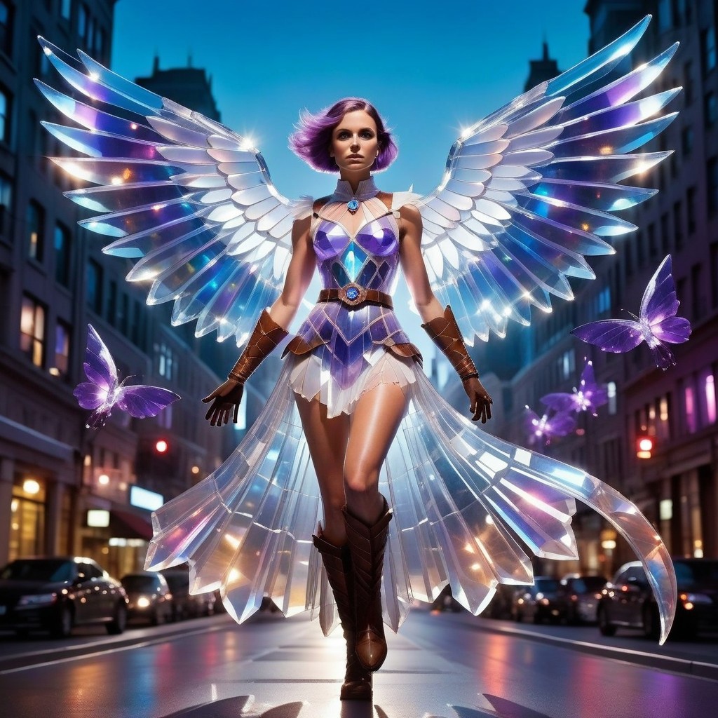 cs-cr1stal-v2, a female character with a futuristic, fantasy-inspired design. The character has fair skin and short, purple hair adorned with a white flower. She has large, expressive blue eyes and a delicate, feminine face. She is dressed in a vibrant, white and purple outfit made with glass that includes a short, frilly dress with a white collar. The dress has a high slit, revealing her black thigh-high stockings made with glass and a glimpse of her upper thighs. Her attire is complemented by long, brown gloves and matching boots made with glass with brown accents. She wears a white belt with a purple gem at the center, adding to the futuristic aesthetic. The character is equipped with large, wings made with glass that have a glowing blue hue, giving her a celestial appearance. Her arms are outstretched, and she appears to be in mid-flight or leaping, suggesting motion and energy. The background is a futuristic city landscape.