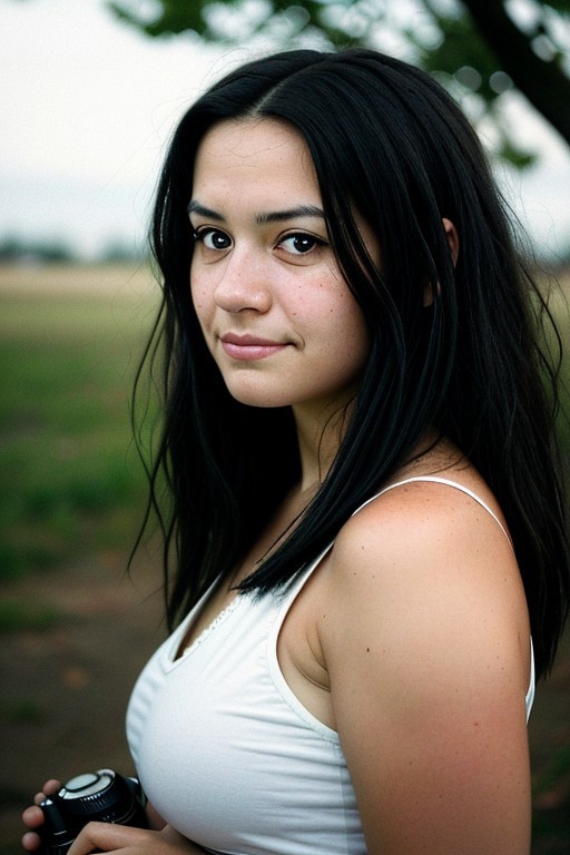 The image portrays a young woman with long, dark hair holding a vintage camera close to her face, partially obscuring one of her eyes. She gazes directly into the lens with an intense, thoughtful expression. The photograph has a distinct cinematic and nostalgic aesthetic, with soft lighting, a grainy texture, and subtle color grading that gives it a vintage, film-like quality. Subject and Composition The subject's face is positioned slightly off-center, drawing immediate attention to her sharp and expressive features. Her dark, well-defined eyebrows frame her deep-set eyes, which are slightly shadowed, adding to the introspective mood of the image. Her lips, which are slightly parted and tinted a natural red, contrast subtly with her smooth, pale skin. Strands of hair fall loosely across her face, reinforcing the unposed, organic nature of the portrait. side view, The camera she holds is an older model, silver and black with a rounded lens, possibly a vintage point-and-shoot film camera. Its reflective surface catches some light, making it a noticeable focal point. Her fingers gently rest on the camera's body, showcasing her relaxed grip, suggesting familiarity and comfort with the device. The camera partially obscures her left eye, creating an artistic and symbolic interplay between the act of capturing an image and being observed.