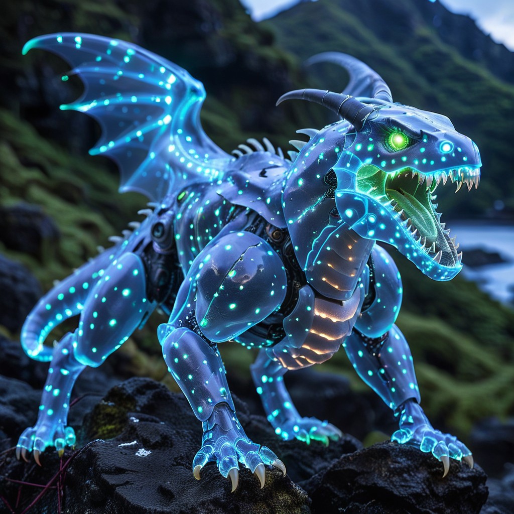 codeandigital, c0dean0igital, cyberw0rlds, no humans, dragon made of bioluminescent organisms, mountain background, wings made of bioluminescent organisms, claws, solo, open mouth, tail, green eyes, sharp teeth, teeth, monster, robot, full body, non-humanoid robot, horns, mecha, flying, tongue, from side, creature, fangs, science fiction, glowing, spikes, bioluminescent organisms scales, green gem, looking at viewer, armor made of bioluminescent organisms, Tokio streets background, Tokio, mountain, Fuji