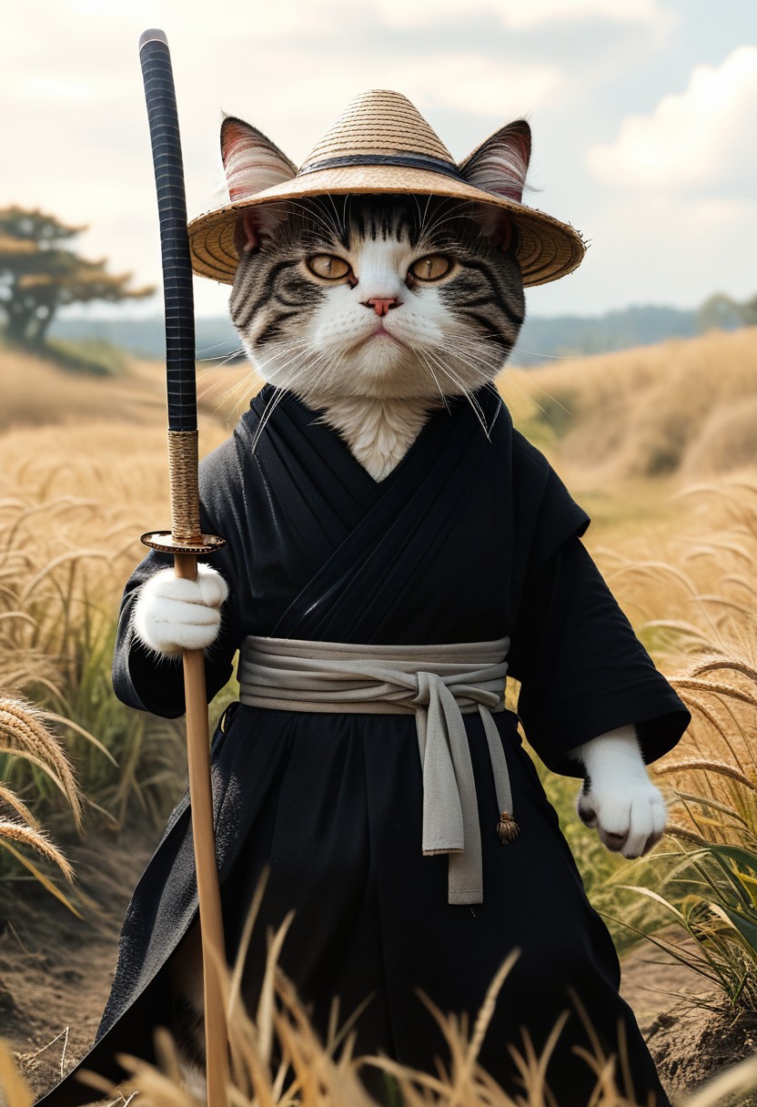A humanoid cat, ronnin. wearing long black japanese robes and a straw hat. He has a katana in a sheath on his hip. He is in a field. Full body Cinematic lighting, volumetric lighting, 8k quality