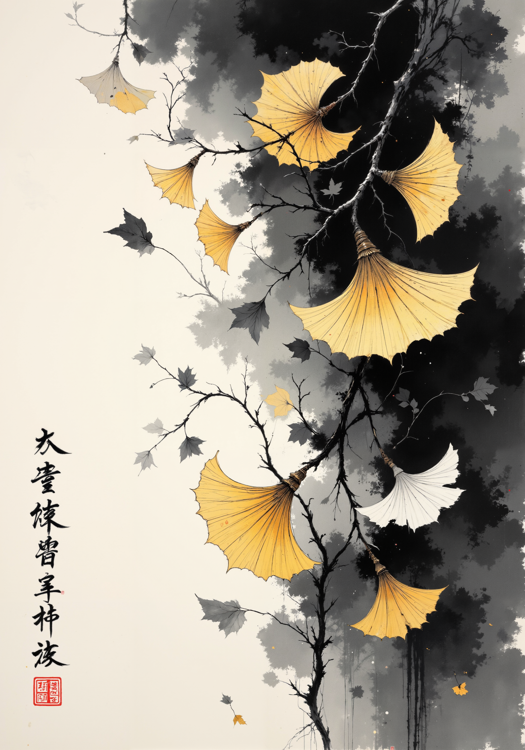 Poetic sumi-e with meticulously rendered gingko leaves cascading across washi paper, embodying the concept of mono no aware. The traditional ink wash technique creates a gradient from deep black to misty gray, with negative space suggesting autumn wind. Gold leaf accents catch imaginary light, while asymmetrical composition draws the eye through bold brush strokes and delicate detailing. Minimal red seal marks anchor the lower corner, balanced by calligraphic kanji suggesting impermanence. The scattered leaves display deliberate imperfections celebrating wabi-sabi principles, some rendered with a single masterful brushstroke, others with textural dry-brush technique. Subtle indigo undertones evoke twilight transitioning to evening, capturing the melancholic beauty of nature's transitional moments through the philosophical lens of yugen. <lora:aidmaFLUXPro1.1-FLUX-v0.3:0.7> <lora:ck-charcoal-drawing-000014:0.5> <lora:Niji B:0.7> <lora:bm-goth_epoch_1:0.3> <lora:flux_ptchkrawk:0.1> <lora:flux_dev:1>