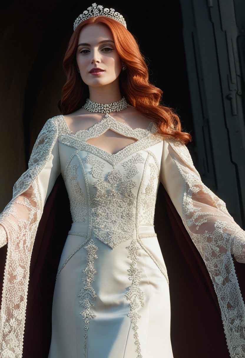 (ZARIMAN:3), (dadsa:2.9), (masterpiece), (illustration), (castle), (pale skin), (grace lady), jewelry-tiara, //ruby_deep-orange hair, long_wavy hair//, //shiny-green eyes//, nose, (shiny lip), closed mouth, //gray long lace dress//, //white garter, elbow gloves, royal_cape//, looking at viewer, standing, close-up, <lora:conceptSceneryScene_v10:0.7>, add-detail-xl, <lora:add_detail:1>, censored, puffy sleeves, closed dress, beautiful high-neck top, fully dressed,