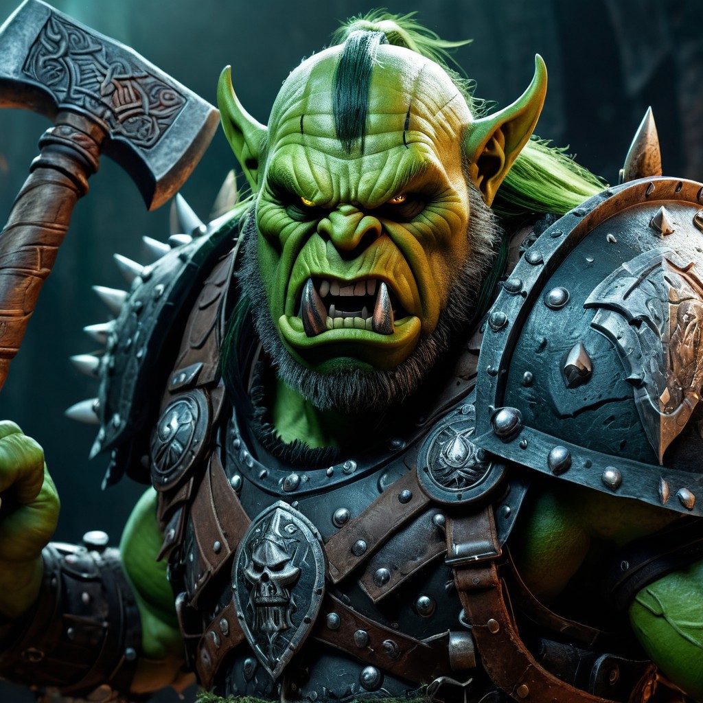 A green ork wearing a warrior armor, holding battle hammer, angry, screaming, imposing, threatening, battle scenario, night, detailed face, detailed eyes, detailed face, detailed teeth, detailed skin, detailed hands, detailed fingers, ultra detailed, intrincate details, cinematic lighting, best quality, amazing, masterpiece, epic, movie scene, cinematic film grain, 8k