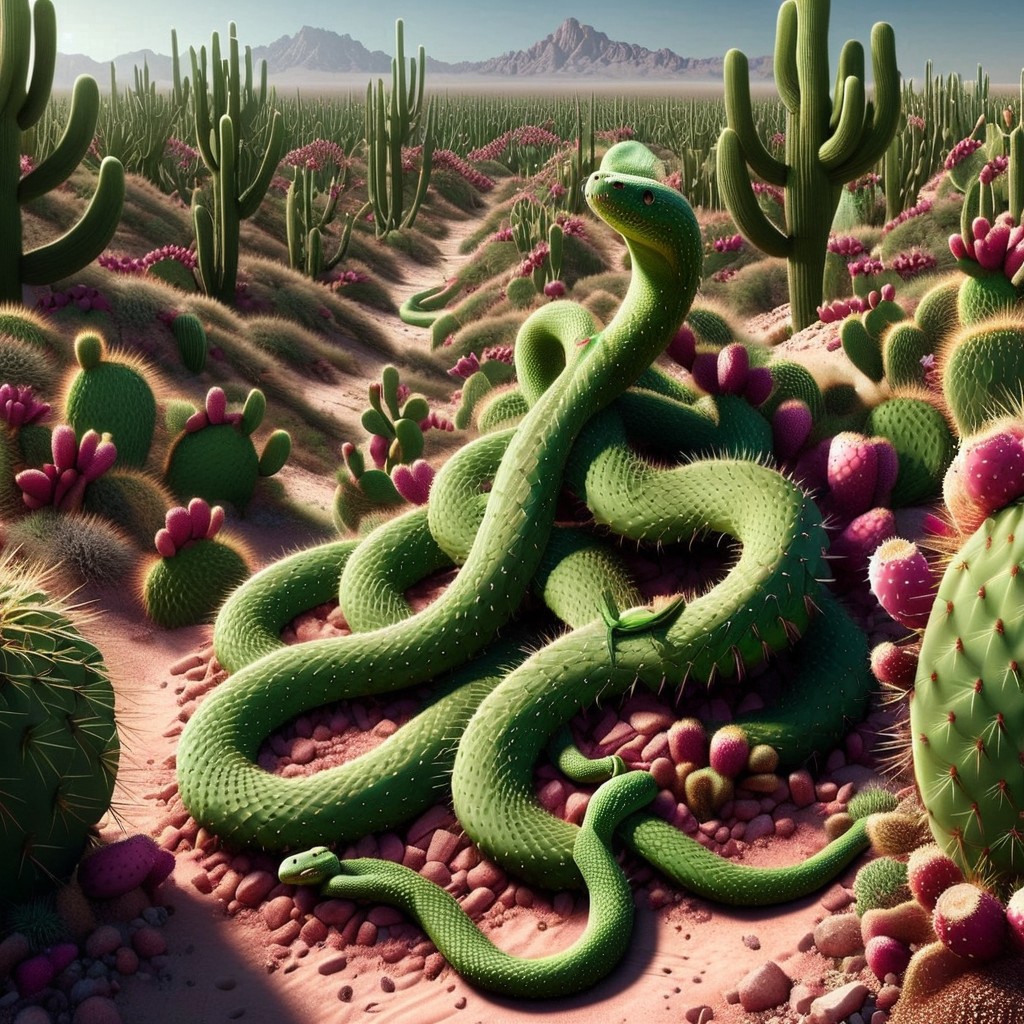 Snake slithering through desert cactuses, tech <lora:Prickly Pear Style v1:1>, Prickly Pear Style,
