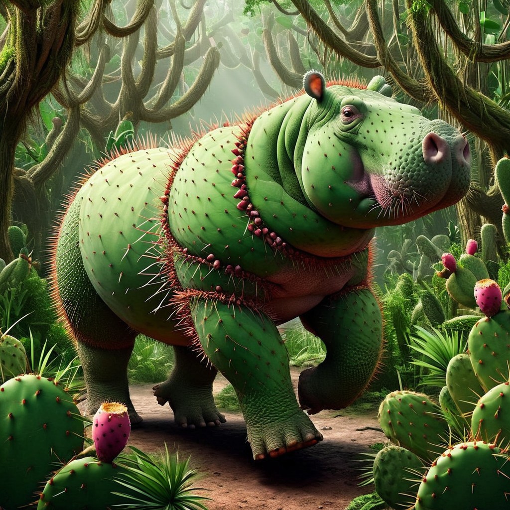 Harry the Hippo striding therough the jungle, parrots <lora:Prickly Pear Style v1:1>, Prickly Pear Style,