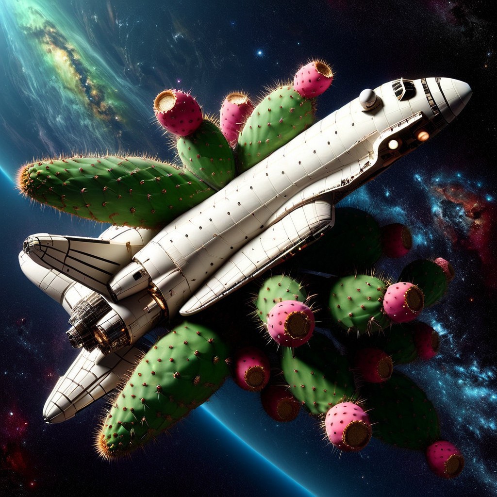 Space shuttle flying through space. prickly pear planets, tech <lora:Prickly Pear Style v1:1>, Prickly Pear Style,