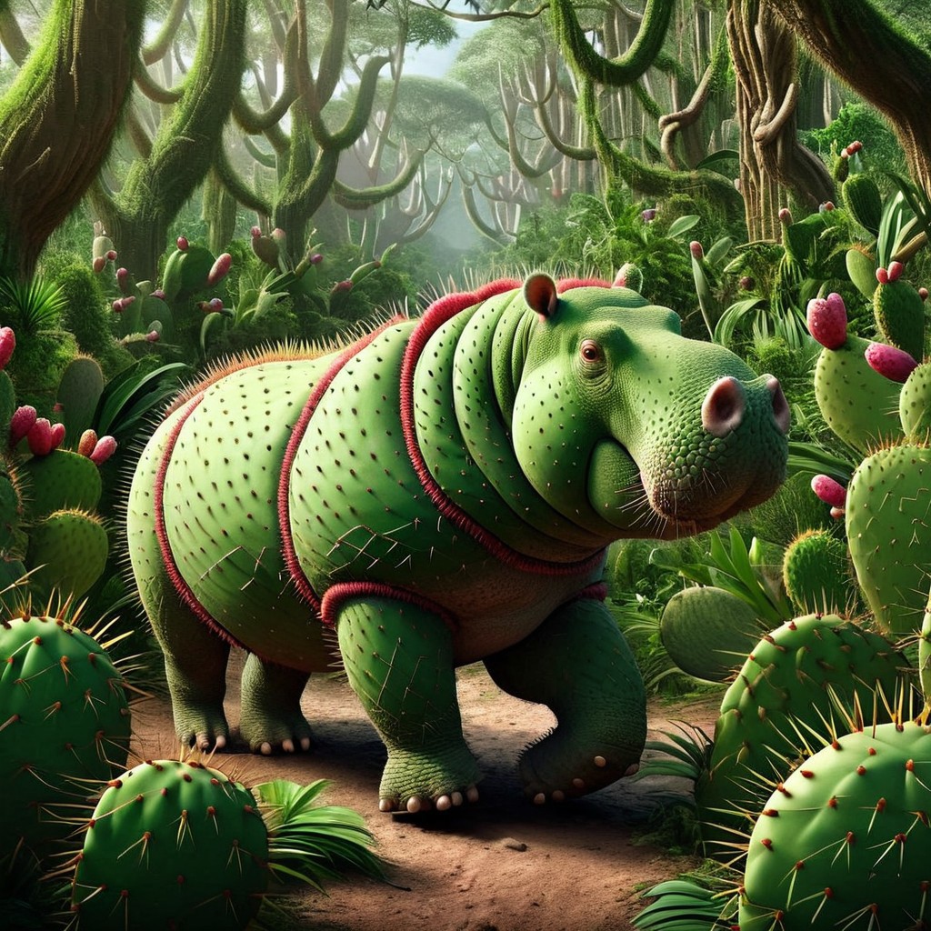 Harry the Hippo striding therough the jungle, parrots <lora:Prickly Pear Style v1:1>, Prickly Pear Style,