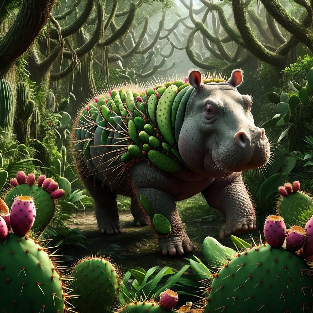 Harry the Hippo striding therough the jungle, parrots <lora:Prickly Pear Style v1:1>, Prickly Pear Style,