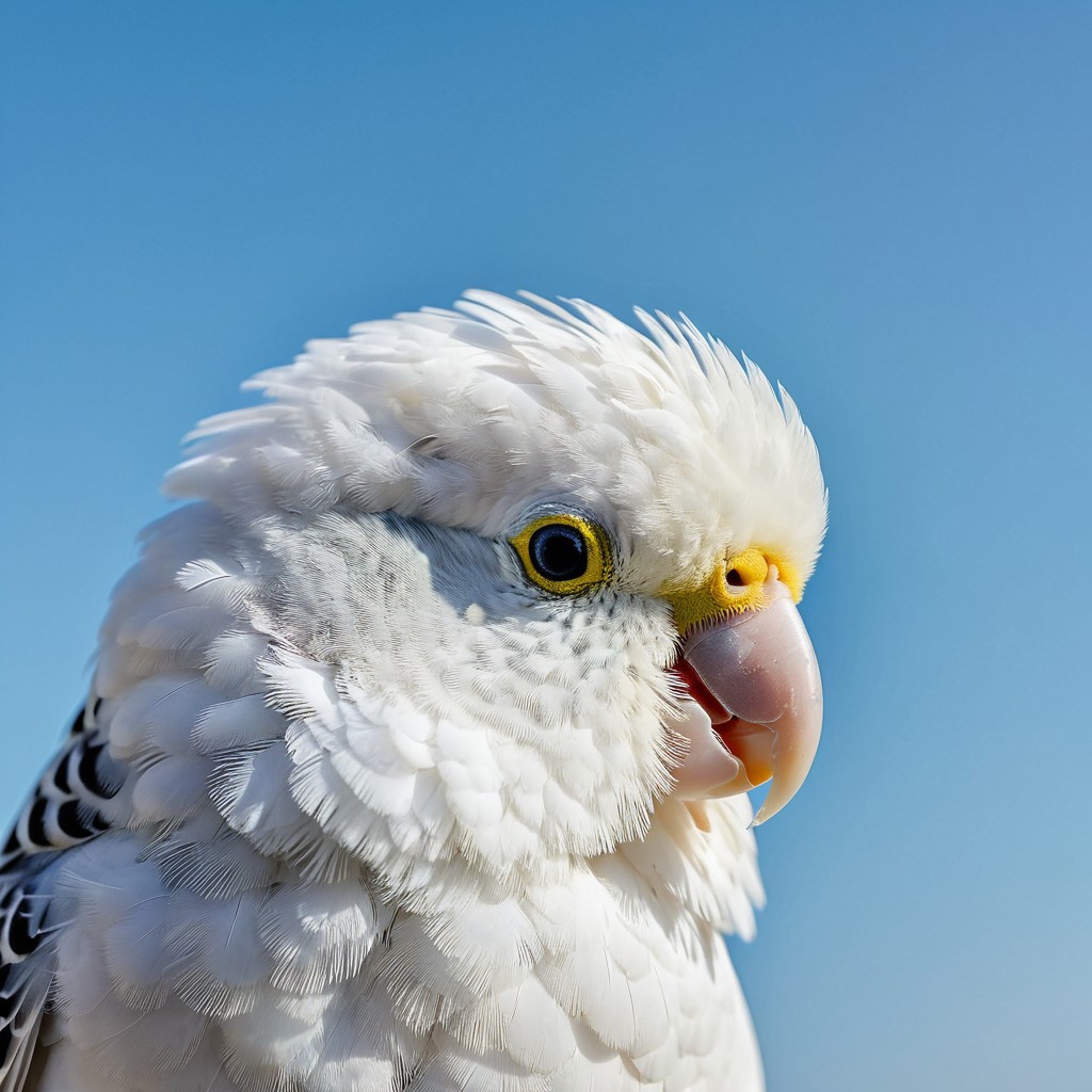 portrait, masterpiece, 4k, ray tracing, intricate details, highly detailed, hyper realistic, 8k RAW editorial photo. a cute white budgie, head tilted and slightly blinking. The budgie's feathers should be soft and fluffy, the background should be a blue sky, dramatic light, shallow depth of field, high budget,