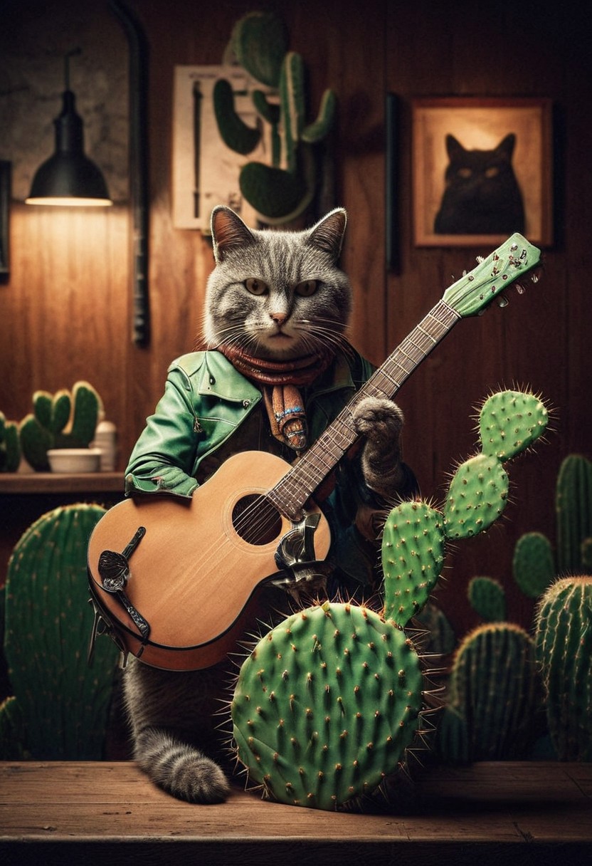 Product photo, a cat as a cowboy, coyboy gear, holding a cactus guitar, dramatic lighting, spotlight, in a bar, detailed, polaroid photo