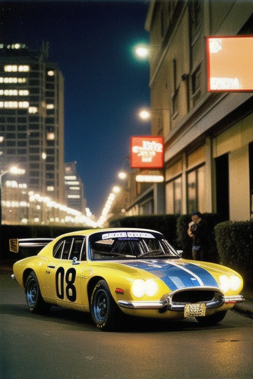 The racing car on the street, night lights, 1970, midnight, megapolis