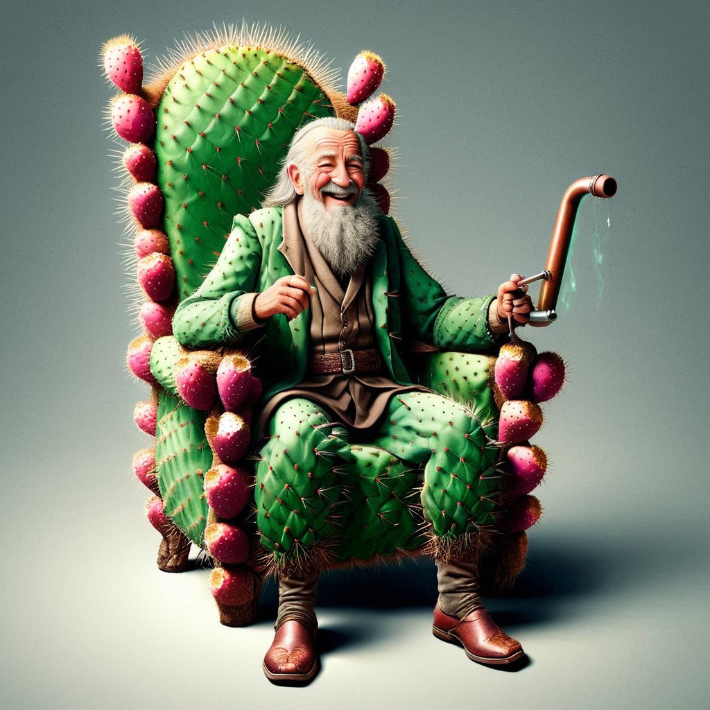 old man, old wizard, sitting, pipe, laughing, armchair, <lora:Prickly Pear Style v1:1>, Prickly Pear Style,