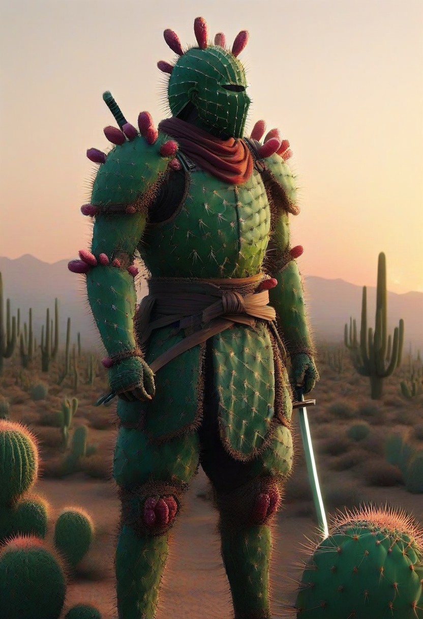 Prickly Pear Style, A lone samurai standing in the desert, wearing an armor set made of interwoven cactus spines, a thorn-covered katana glowing under the sunset, wind blowing through a field of neon succulents, ancient desert pagoda in the background, cinematic warrior aesthetic