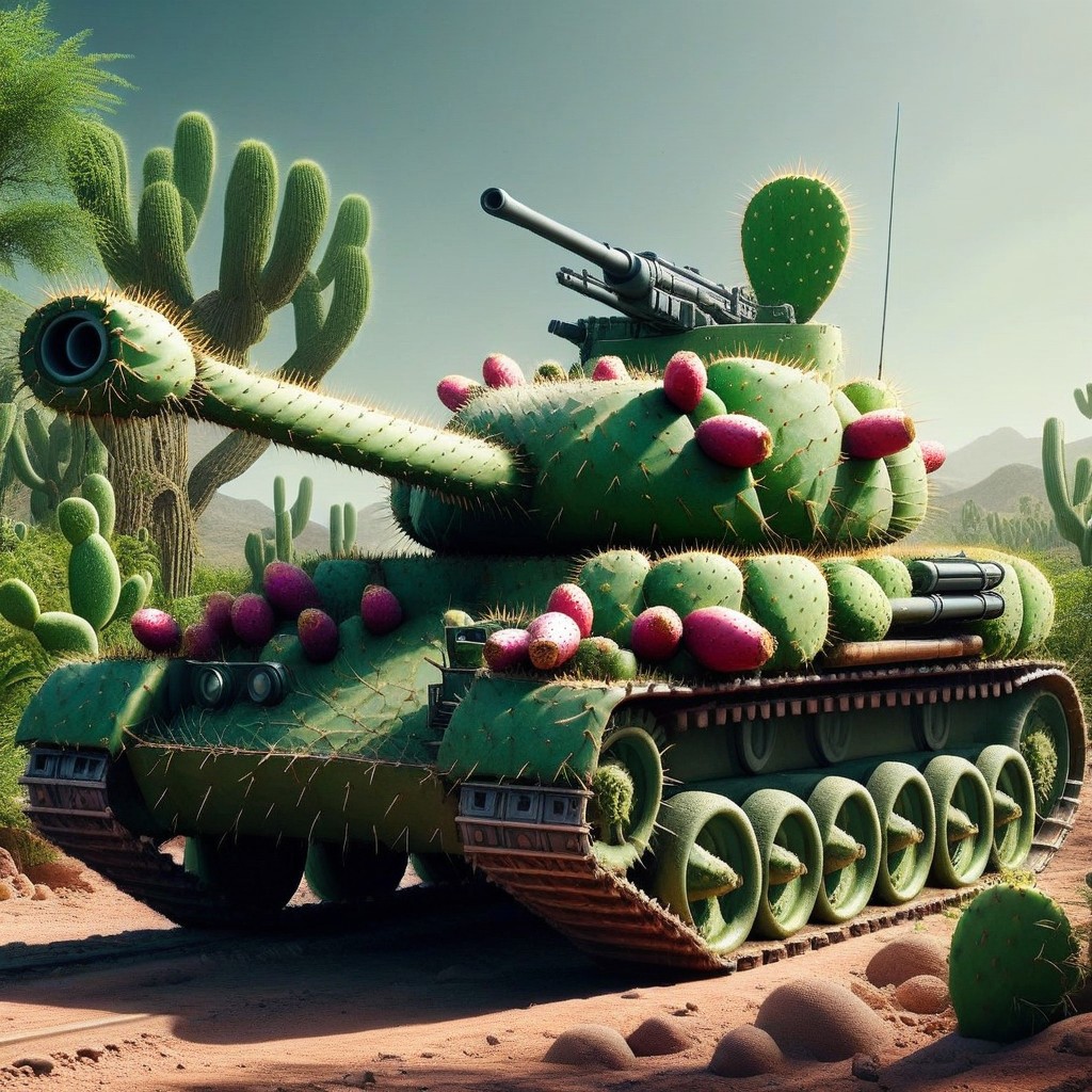 [tank]tank panzer wagon, gun barrel, driving through the jungle and desert, tech <lora:Prickly Pear Style v1:1>, Prickly Pear Style,
