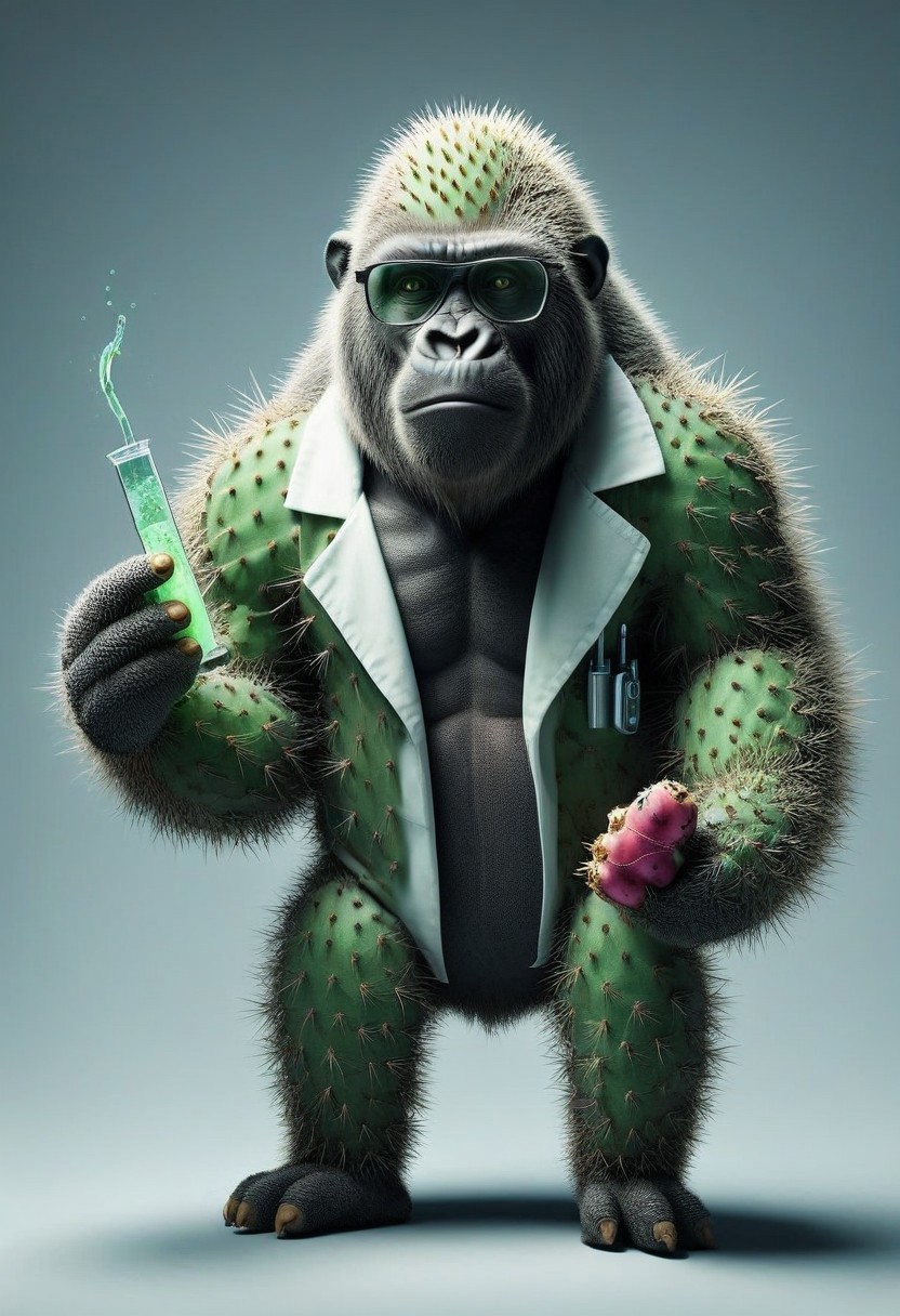 gorilla, lab coat, glasses, holding a vial with glowing liquid, laboratory background, Prickly Pear Style,