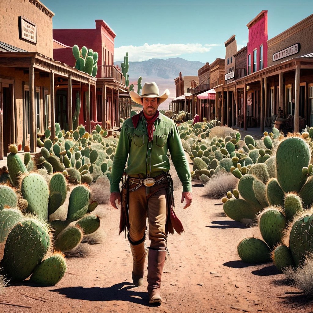 Cowboy walking through old western town tumble weed <lora:Prickly Pear Style v1:1>, Prickly Pear Style,