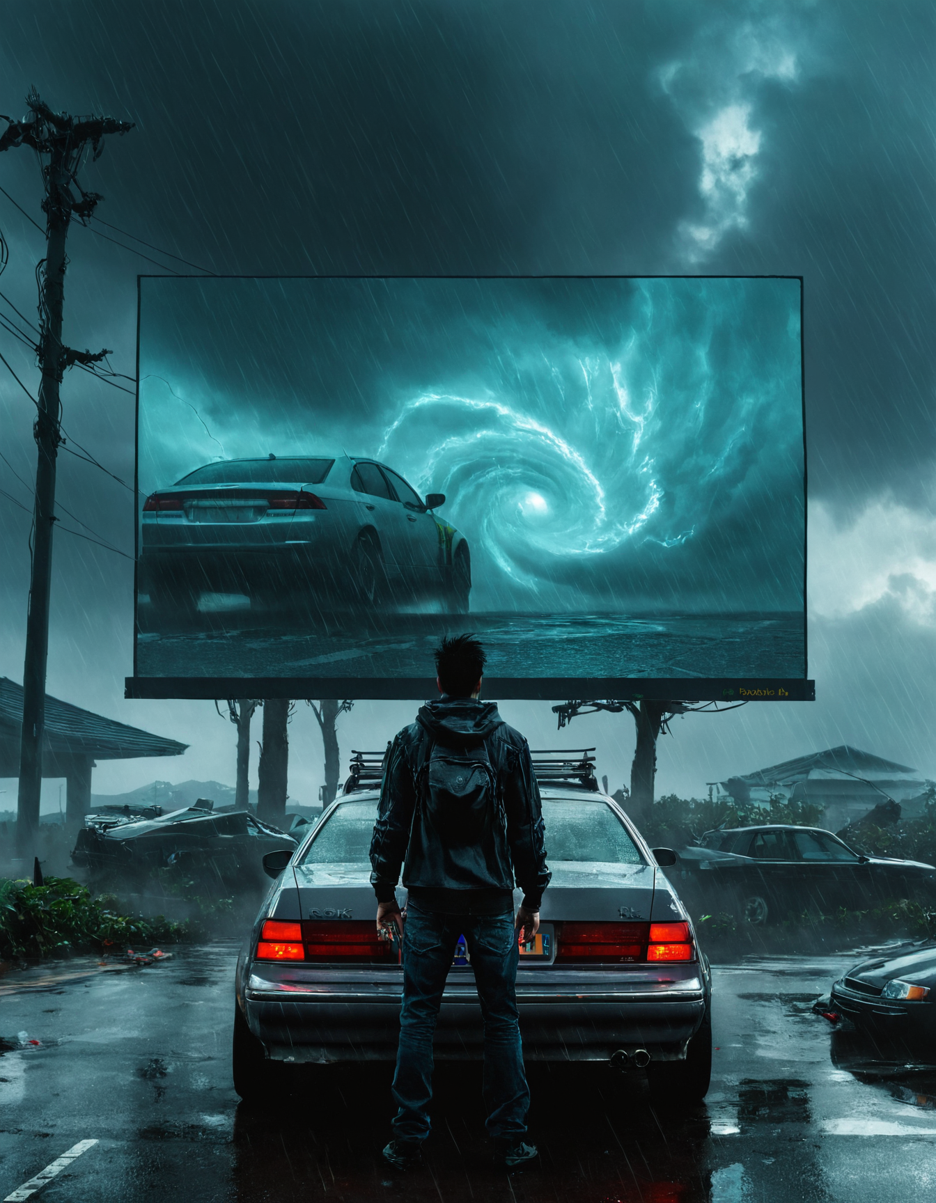 <lora:r0k00g00th:1>,r0k00g00th,r0kur3&l1tyHD. cyberpunk art,, a person standing in front of a large screen with a person on it's back and a car in front of it [2], prompt . ,weather, (stormy, hurricanes, typhoons:1.5), strong tropical storms with high winds,,